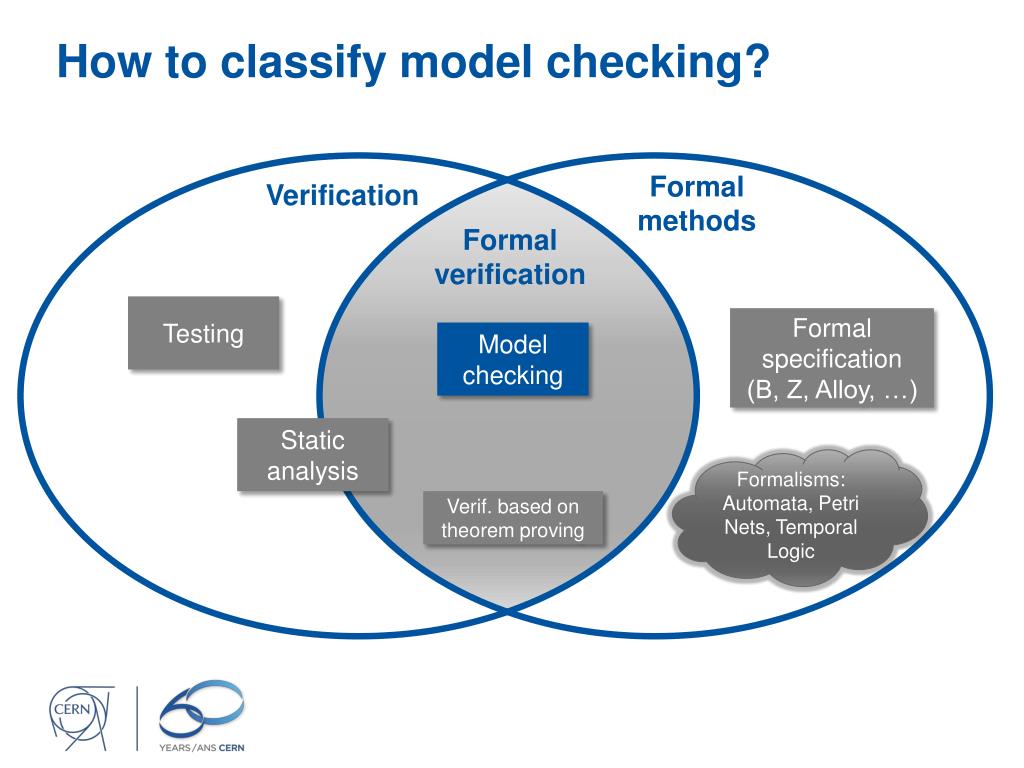 How to classify model checking? Formal methods Verification Formal verification Testing Formal specification(B, Z, Alloy, …) Model checking Static analysis Formalisms: Automata, Petri Nets, Temporal Logic Verif. based on theorem proving