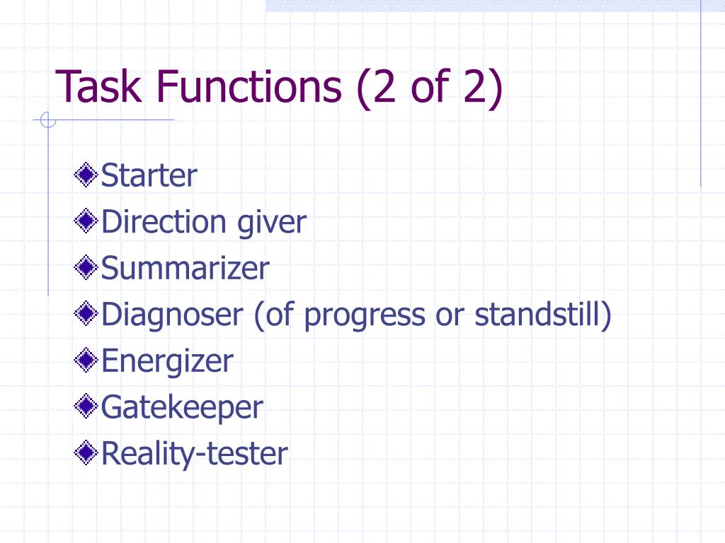 Task Functions (2 of 2) Starter Direction giver Summarizer Diagnoser (of progress or standstill) Energizer Gatekeeper Reality-tester