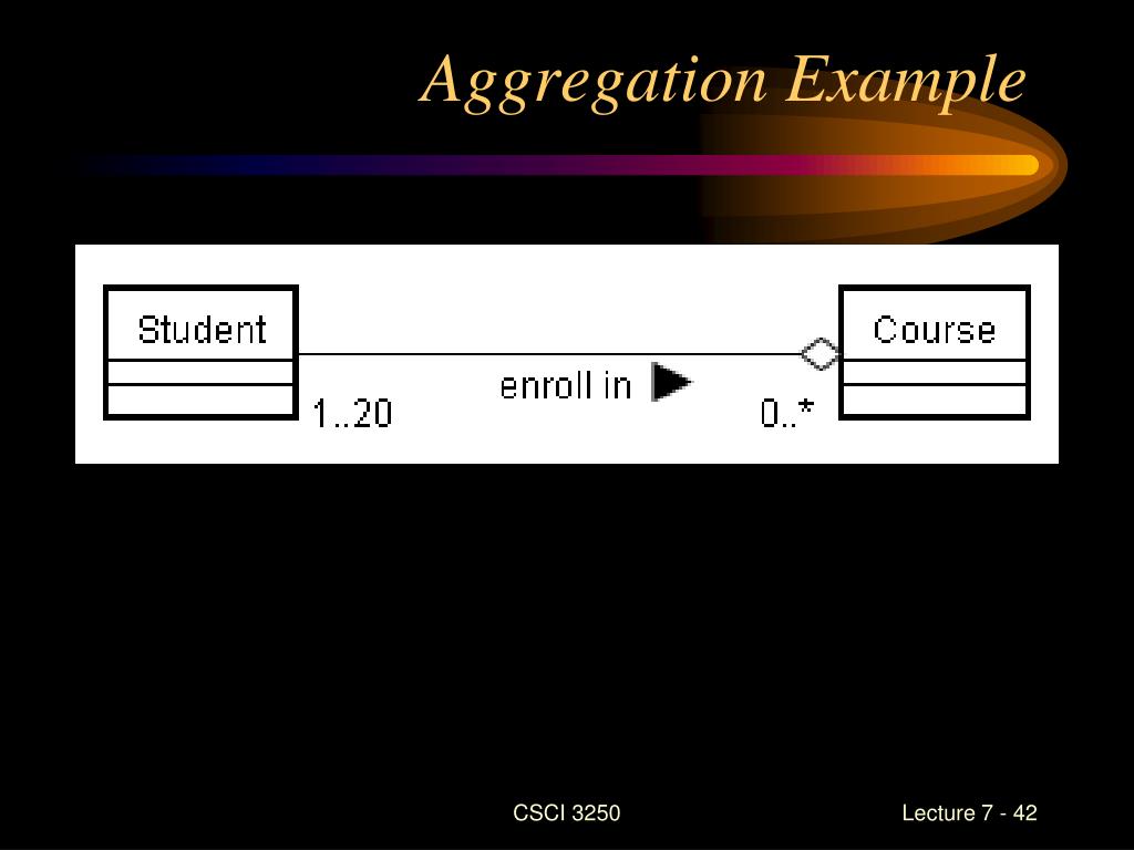 Aggregation • Models the “whole/part” relationship • Represented by a solid line connecting the two classes • With an open diamond at the end of the line adjacent to the “whole” class CSCI 3250