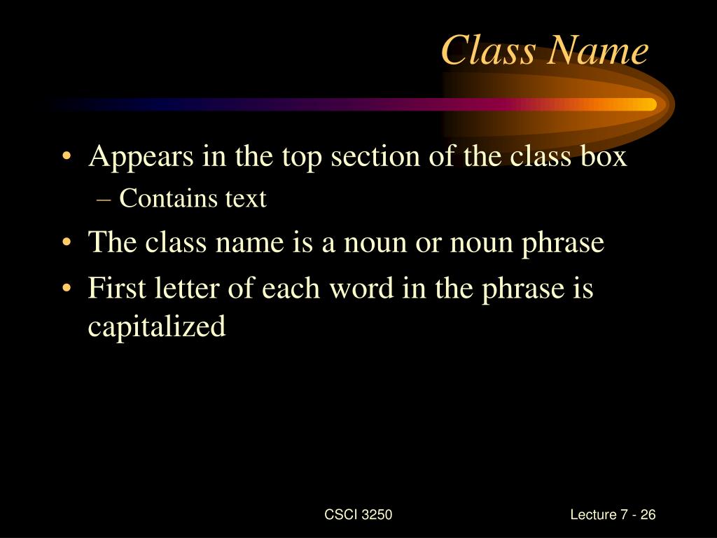 Class Name • Appears in the top section of the class box • Contains text • The class name is a noun or noun phrase • First letter of each word in the phrase is capitalized CSCI 3250