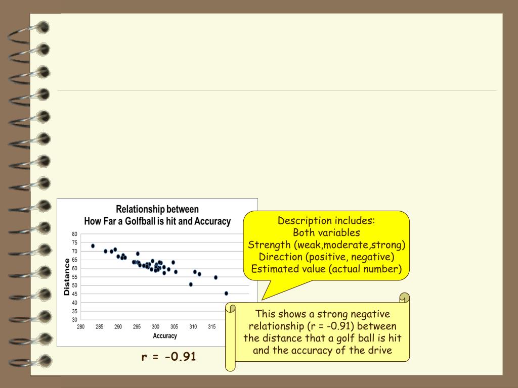 Description includes: Both variables Strength (weak,moderate,strong) Direction (positive, negative) Estimated value (actual number) This shows a strong negative relationship (r = -0.91) between the distance that a golf ball is hit and the accuracy of the drive r = -0.91