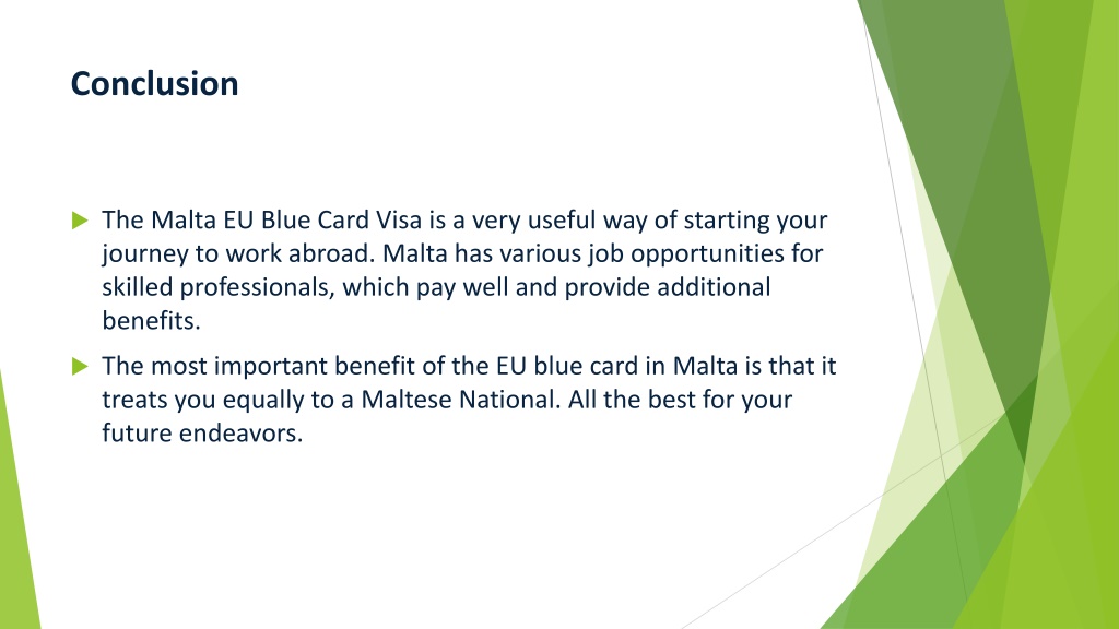 Conclusion • The Malta EU Blue Card Visa is a very useful way of starting your journey to work abroad. Malta has various job opportunities for skilled professionals, which pay well and provide additional benefits. • The most important benefit of the EU blue card in Malta is that it treats you equally to a Maltese National. All the best for your future endeavors.