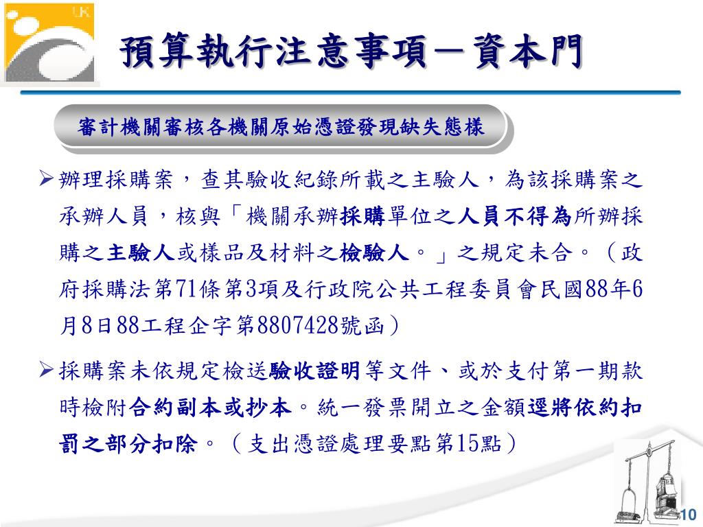 預算執行注意事項-資本門 審計機關審核各機關原始憑證發現缺失態樣 • 辦理採購案,查其驗收紀錄所載之主驗人,為該採購案之承辦人員,核與「機關承辦採購單位之人員不得為所辦採購之主驗人或樣品及材料之檢驗人。」之規定未合。(政府採購法第71條第3項及行政院公共工程委員會民國88年6月8日88工程企字第8807428號函) • 採購案未依規定檢送驗收證明等文件、或於支付第一期款時檢附合約副本或抄本。統一發票開立之金額逕將依約扣罰之部分扣除。(支出憑證處理要點第15點)