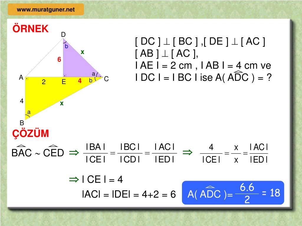 D [ DC ] [ BC ] ,[ DE ] [ AC ] [ AB ] [ AC ], I AE I = 2 cm , I AB I = 4 cm ve I DC I = I BC I ise A( ADC ) = ? A C E 2 4 B www.muratguner.net ÖRNEK b x 6 a 4 b x a ÇÖZÜM BAC CED l CE l = 4 6.6 = 18 A( ADC )= lACl = lDEl = 4+2 = 6 2