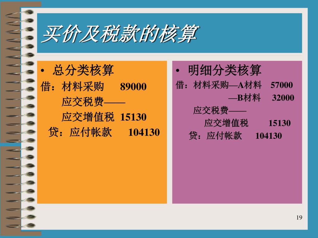 总分类核算 借:材料采购 89000 应交税费—— 应交增值税 15130 贷:应付帐款 104130 明细分类核算 借:材料采购—A材料 57000 —B材料 32000 应交税费—— 应交增值税 15130 贷:应付帐款 104130 买价及税款的核算