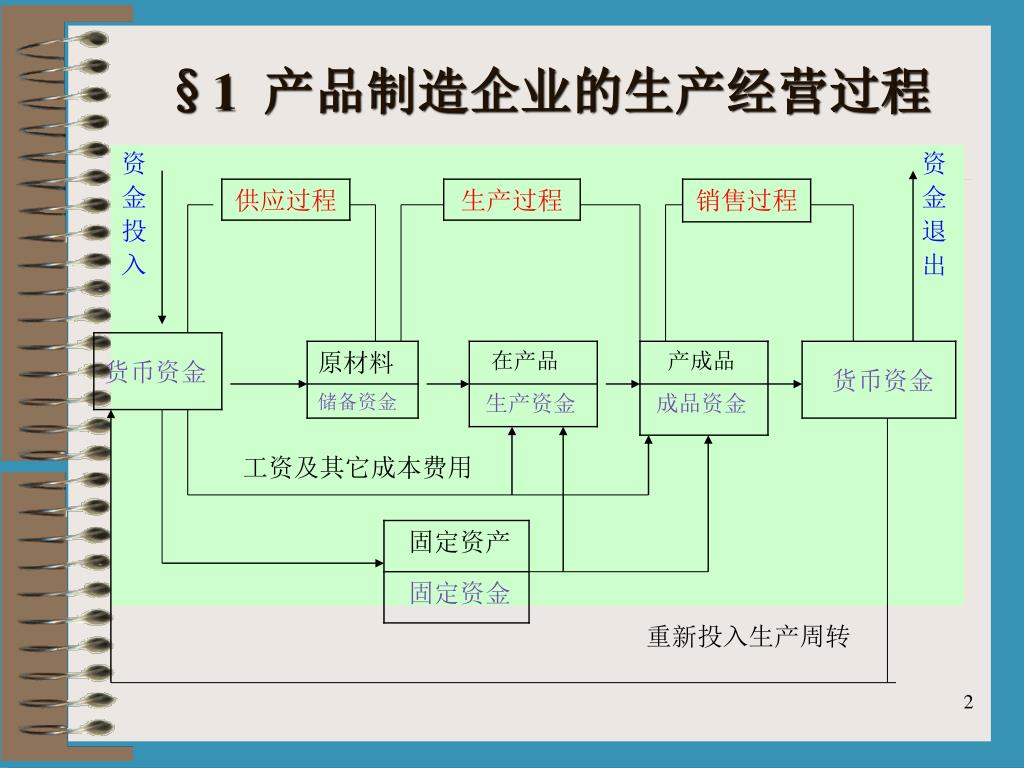 §1 产品制造企业的生产经营过程 资资 金金 投退 入出 工资及其它成本费用 重新投入生产周转