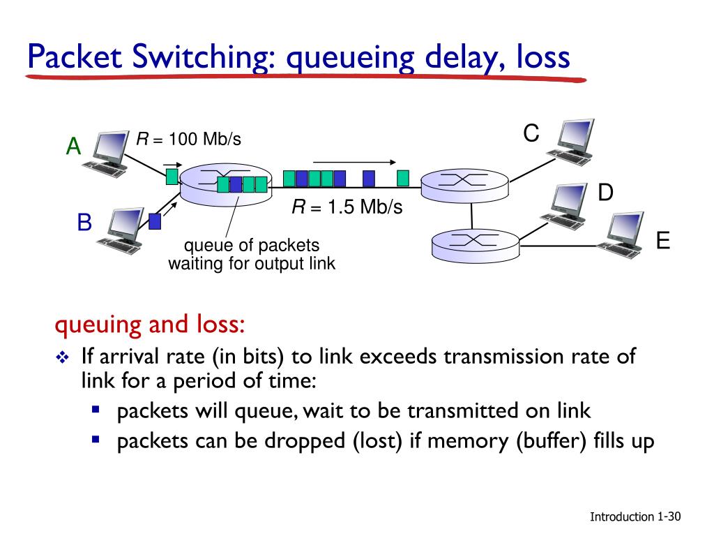 Packet Switching: queueing delay, loss C R = 100 Mb/s A D R = 1.5 Mb/s B E queue of packets waiting for output link queuing and loss: • If arrival rate (in bits) to link exceeds transmission rate of link for a period of time: • packets will queue, wait to be transmitted on link • packets can be dropped (lost) if memory (buffer) fills up Introduction
