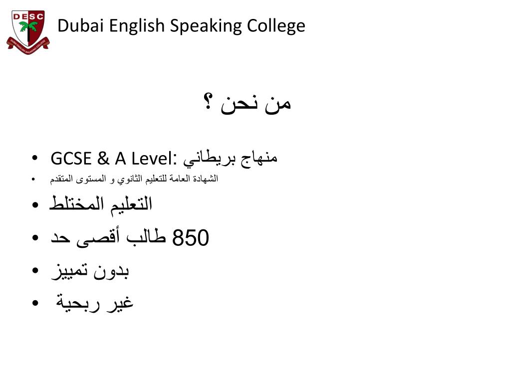 من نحن ؟ • GCSE & A Level منهاج بريطاني : • الشهادة العامة للتعليم الثانوي و المستوى المتقدم • التعليم المختلط • 850 طالب أقصى حد • بدون تمييز • غير ربحية