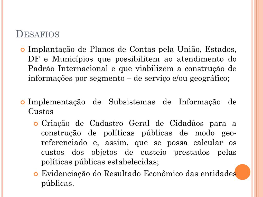Desafios • Implantação de Planos de Contas pela União, Estados, DF e Municípios que possibilitem ao atendimento do Padrão Internacional e que viabilizem a construção de informações por segmento – de serviço e/ou geográfico; • Implementação de Subsistemas de Informação de Custos • Criação de Cadastro Geral de Cidadãos para a construção de políticas públicas de modo geo-referenciado e, assim, que se possa calcular os custos dos objetos de custeio prestados pelas políticas públicas estabelecidas; • Evidenciação do Resultado Econômico das entidades públicas.