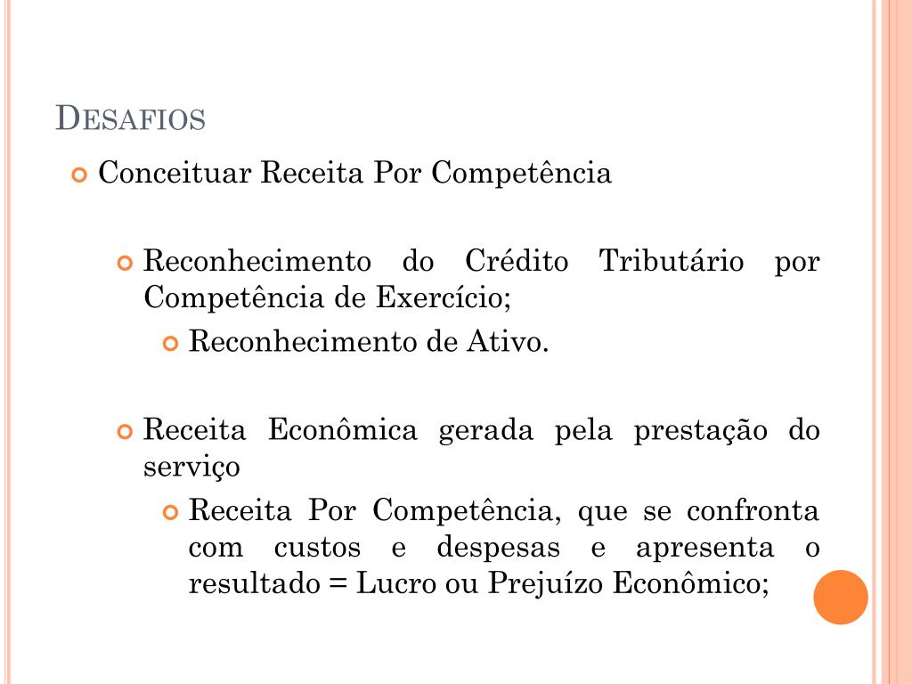 Desafios • Conceituar Receita Por Competência • Reconhecimento do Crédito Tributário por Competência de Exercício; • Reconhecimento de Ativo. • Receita Econômica gerada pela prestação do serviço • Receita Por Competência, que se confronta com custos e despesas e apresenta o resultado = Lucro ou Prejuízo Econômico;