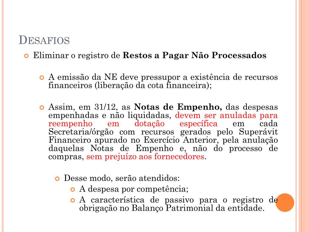 Desafios • Eliminar o registro de Restos a Pagar Não Processados • A emissão da NE deve pressupor a existência de recursos financeiros (liberação da cota financeira); • Assim, em 31/12, as Notas de Empenho, das despesas empenhadas e não liquidadas, devem ser anuladas para reempenho em dotação específica em cada Secretaria/órgão com recursos gerados pelo Superávit Financeiro apurado no Exercício Anterior, pela anulação daquelas Notas de Empenho e, não do processo de compras, sem prejuízo aos fornecedores. • Desse modo, serão atendidos: • A despesa por competência; • A característica de passivo para o registro de obrigação no Balanço Patrimonial da entidade.