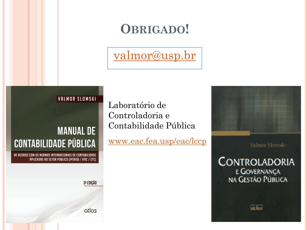 Laboratório de Controladoria e Contabilidade Pública www.eac.fea.usp/eac/lccp Obrigado! valmor@usp.br