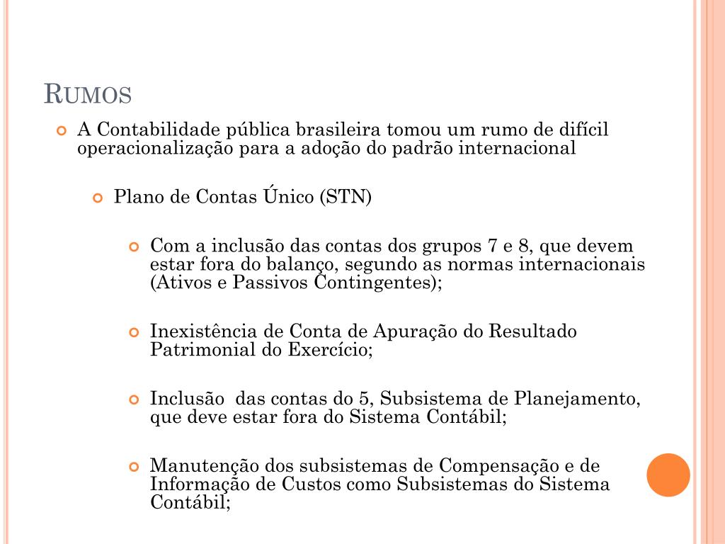 Rumos • A Contabilidade pública brasileira tomou um rumo de difícil operacionalização para a adoção do padrão internacional • Plano de Contas Único (STN) • Com a inclusão das contas dos grupos 7 e 8, que devem estar fora do balanço, segundo as normas internacionais (Ativos e Passivos Contingentes); • Inexistência de Conta de Apuração do Resultado Patrimonial do Exercício; • Inclusão das contas do 5, Subsistema de Planejamento, que deve estar fora do Sistema Contábil; • Manutenção dos subsistemas de Compensação e de Informação de Custos como Subsistemas do Sistema Contábil;