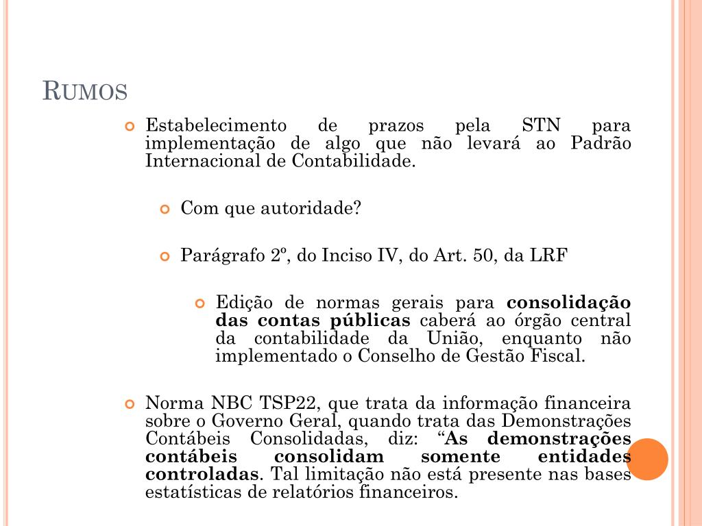 Rumos • Estabelecimento de prazos pela STN para implementação de algo que não levará ao Padrão Internacional de Contabilidade. • Com que autoridade? • Parágrafo 2º, do Inciso IV, do Art. 50, da LRF • Edição de normas gerais para consolidação das contas públicas caberá ao órgão central da contabilidade da União, enquanto não implementado o Conselho de Gestão Fiscal. • Norma NBC TSP22, que trata da informação financeira sobre o Governo Geral, quando trata das Demonstrações Contábeis Consolidadas, diz: “As demonstrações contábeis consolidam somente entidades controladas. Tal limitação não está presente nas bases estatísticas de relatórios financeiros.
