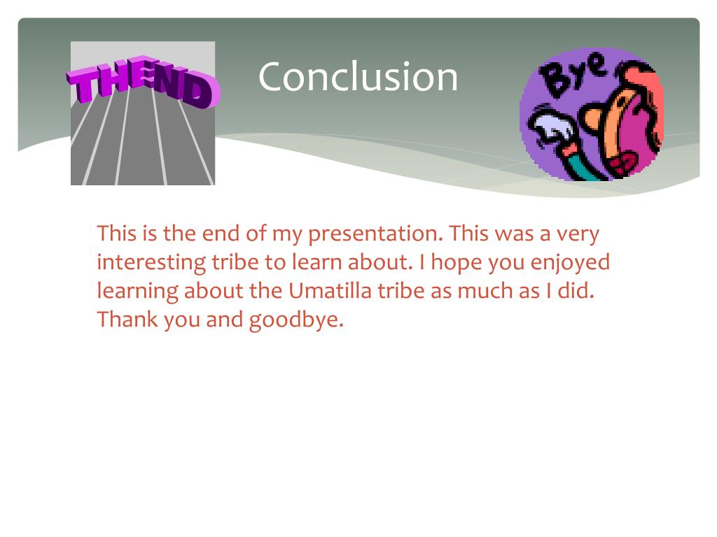 Conclusion This is the end of my presentation. This was a very interesting tribe to learn about. I hope you enjoyed learning about the Umatilla tribe as much as I did. Thank you and goodbye.