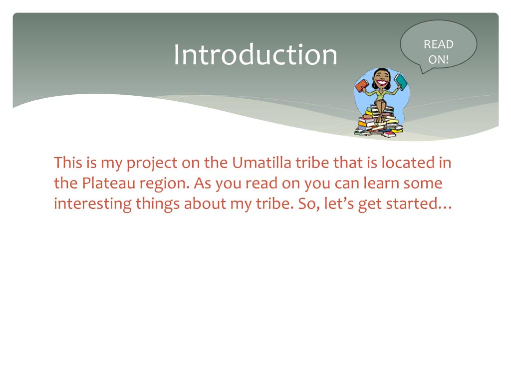 Introduction READ ON! This is my project on the Umatilla tribe that is located in the Plateau region. As you read on you can learn some interesting things about my tribe. So, let’s get started…