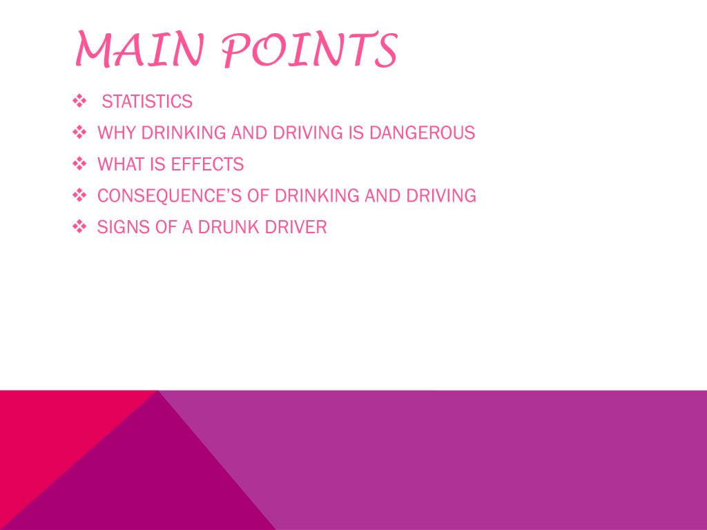MAIN POINTS • STATISTICS • WHY DRINKING AND DRIVING IS DANGEROUS • WHAT IS EFFECTS • CONSEQUENCE’S OF DRINKING AND DRIVING • SIGNS OF A DRUNK DRIVER