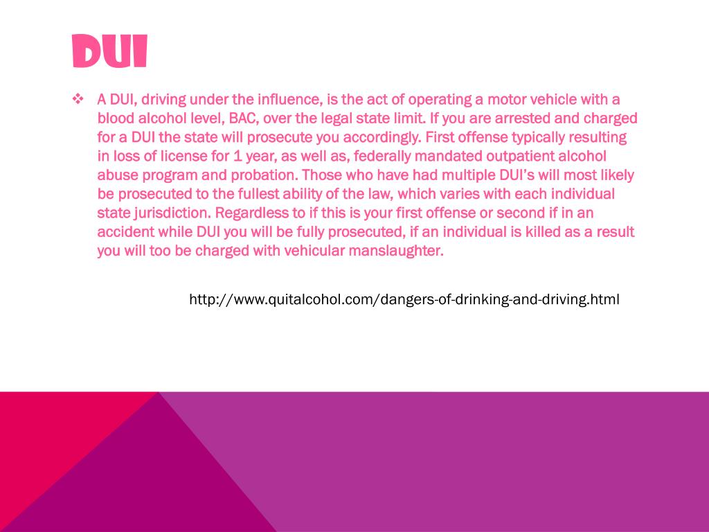 DUI • A DUI, driving under the influence, is the act of operating a motor vehicle with a blood alcohol level, BAC, over the legal state limit. If you are arrested and charged for a DUI the state will prosecute you accordingly. First offense typically resulting in loss of license for 1 year, as well as, federally mandated outpatient alcohol abuse program and probation. Those who have had multiple DUI’s will most likely be prosecuted to the fullest ability of the law, which varies with each individual state jurisdiction. Regardless to if this is your first offense or second if in an accident while DUI you will be fully prosecuted, if an individual is killed as a result you will too be charged with vehicular manslaughter. http://www.quitalcohol.com/dangers-of-drinking-and-driving.html