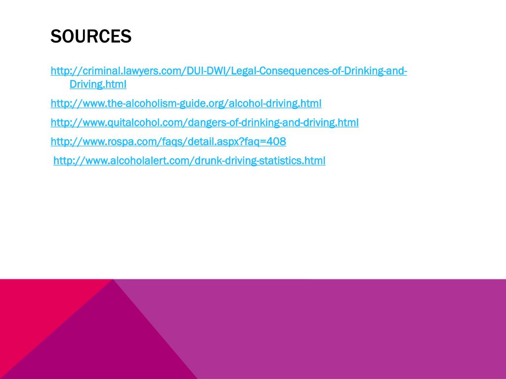 SOURCES • http://criminal.lawyers.com/DUI-DWI/Legal-Consequences-of-Drinking-and-Driving.html • http://www.the-alcoholism-guide.org/alcohol-driving.html • http://www.quitalcohol.com/dangers-of-drinking-and-driving.html • http://www.rospa.com/faqs/detail.aspx?faq=408 • http://www.alcoholalert.com/drunk-driving-statistics.html