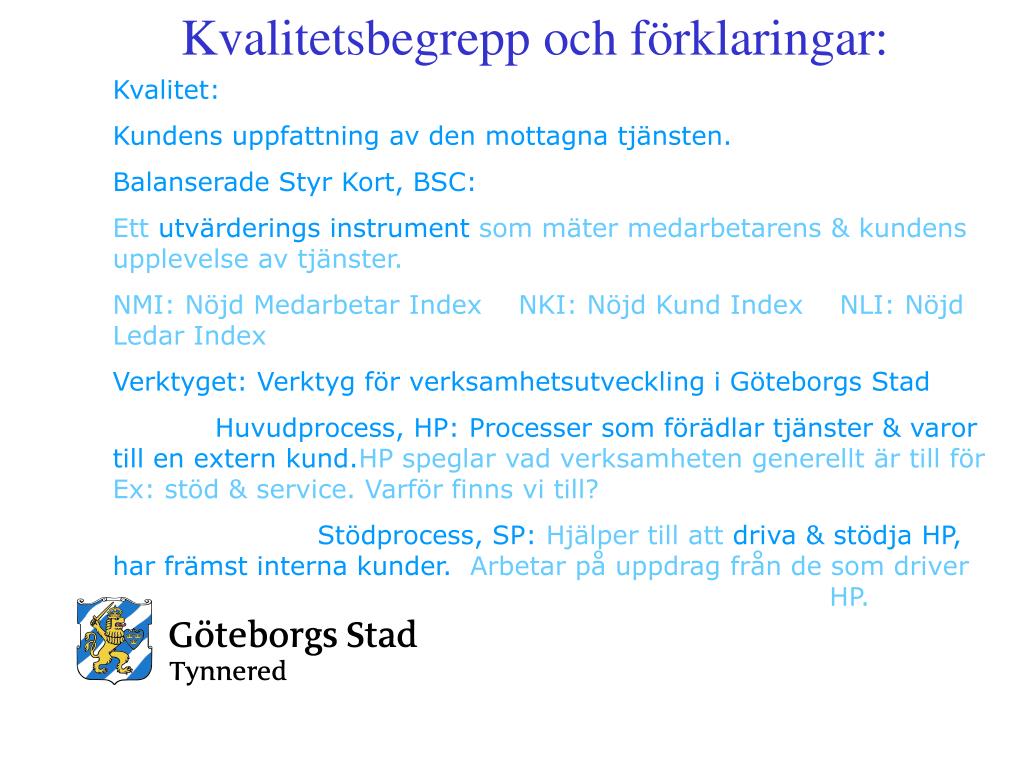 Kvalitetsbegrepp och förklaringar: Kvalitet: Kundens uppfattning av den mottagna tjänsten. Balanserade Styr Kort, BSC: Ett utvärderings instrument som mäter medarbetarens & kundens upplevelse av tjänster. NMI: Nöjd Medarbetar Index NKI: Nöjd Kund Index NLI: Nöjd Ledar Index Verktyget:Verktyg för verksamhetsutveckling i Göteborgs Stad Huvudprocess, HP:Processer som förädlar tjänster & varor till en extern kund.HP speglar vad verksamheten generellt är till för Ex: stöd & service. Varför finns vi till? Stödprocess, SP:Hjälper till att driva & stödja HP, har främst interna kunder. Arbetar på uppdrag från de som driver HP.