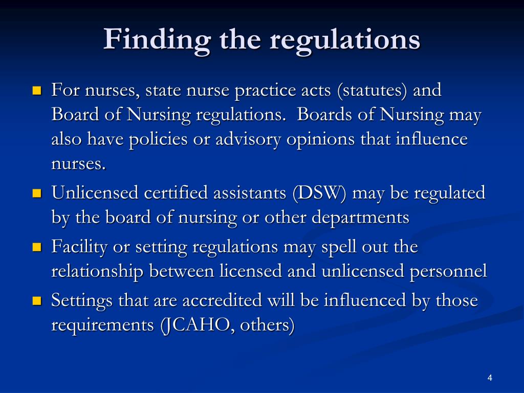 Finding the regulations For nurses, state nurse practice acts (statutes) and Board of Nursing regulations. Boards of Nursing may also have policies or advisory opinions that influence nurses. Unlicensed certified assistants (DSW) may be regulated by the board of nursing or other departments Facility or setting regulations may spell out the relationship between licensed and unlicensed personnel Settings that are accredited will be influenced by those requirements (JCAHO, others)