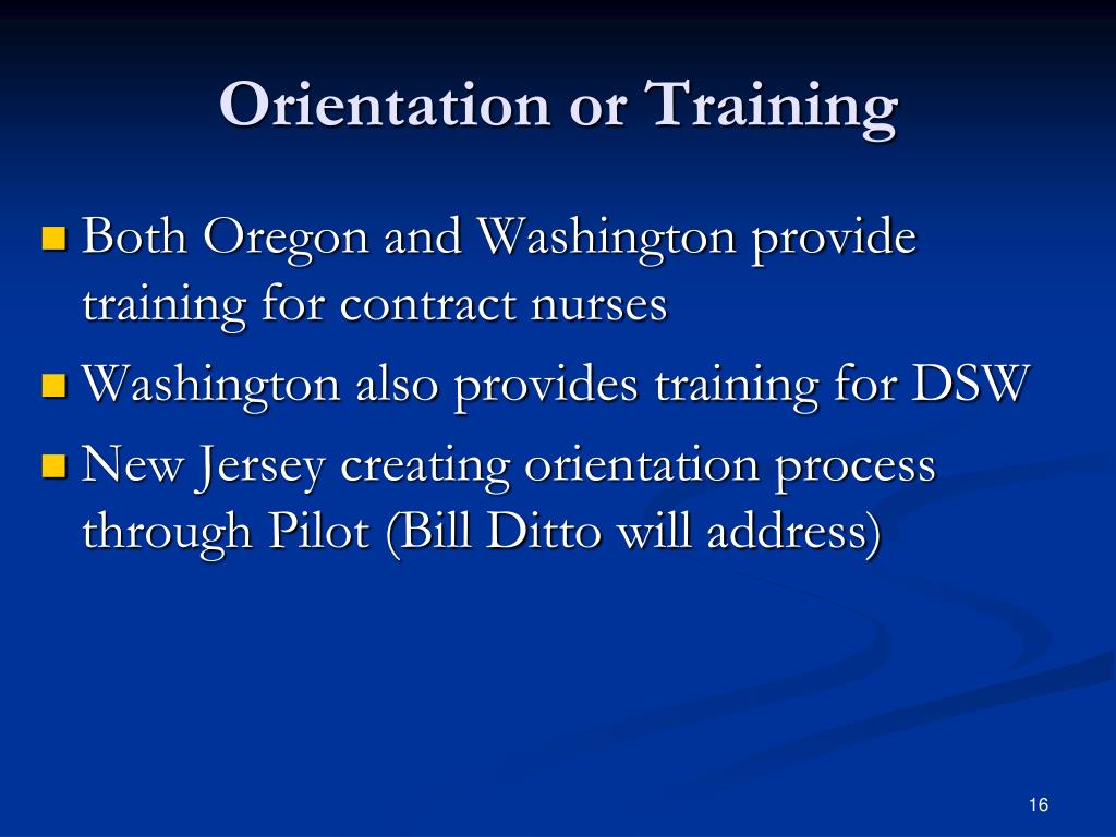 Orientation or Training • Both Oregon and Washington provide training for contract nurses • Washington also provides training for DSW • New Jersey creating orientation process through Pilot (Bill Ditto will address)