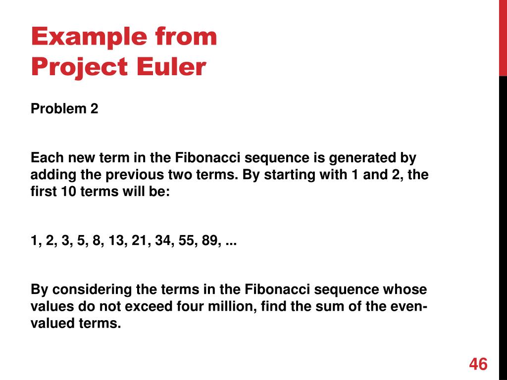 Example fromProject Euler Problem 2 Each new term in the Fibonacci sequence is generated by adding the previous two terms. By starting with 1 and 2, the first 10 terms will be: 1, 2, 3, 5, 8, 13, 21, 34, 55, 89, ... By considering the terms in the Fibonacci sequence whose values do not exceed four million, find the sum of the even-valued terms.