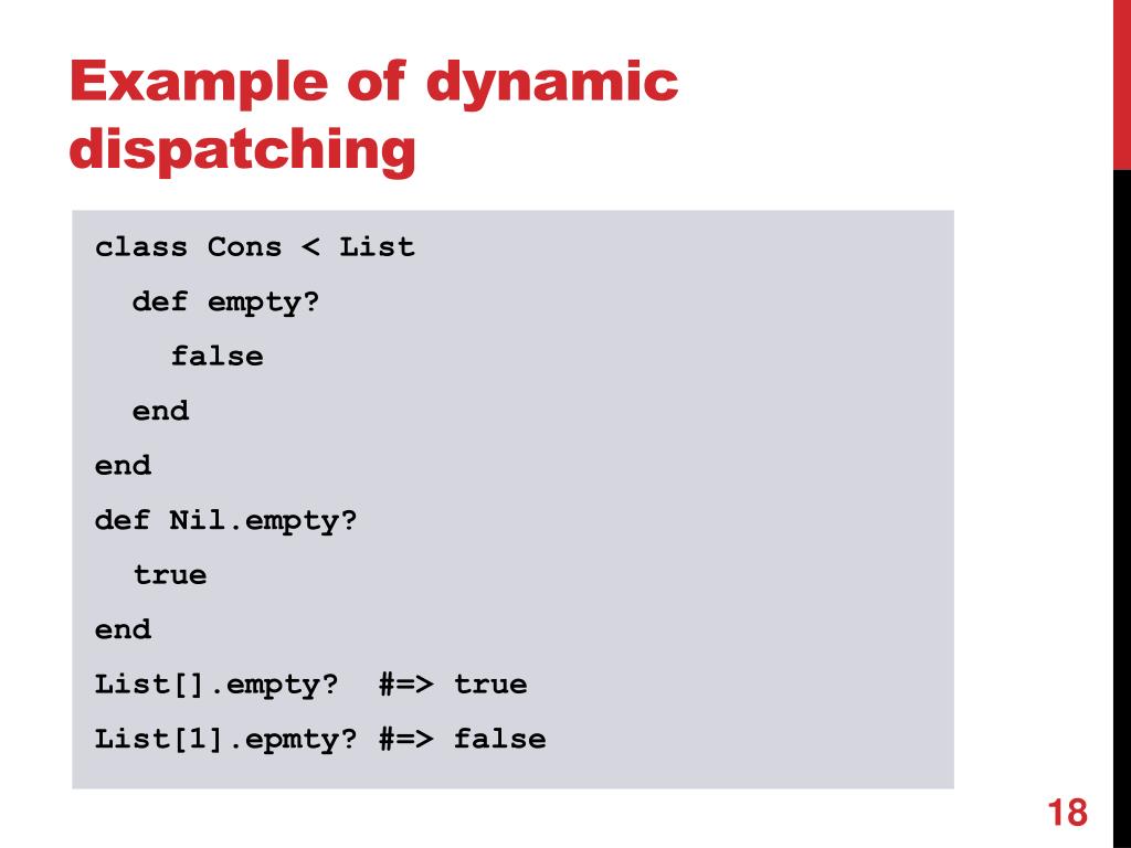 Example of dynamic dispatching class Cons < List defempty? false end end defNil.empty? true end List[].empty? #=> true List[1].epmty? #=> false