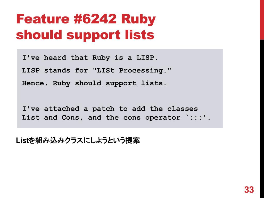 Feature #6242 Ruby should support lists I've heard that Ruby is a LISP. LISP stands for "LISt Processing." Hence, Ruby should support lists. I've attached a patch to add the classes List and Cons, and the cons operator `:::'. • Listを組み込みクラスにしようという提案