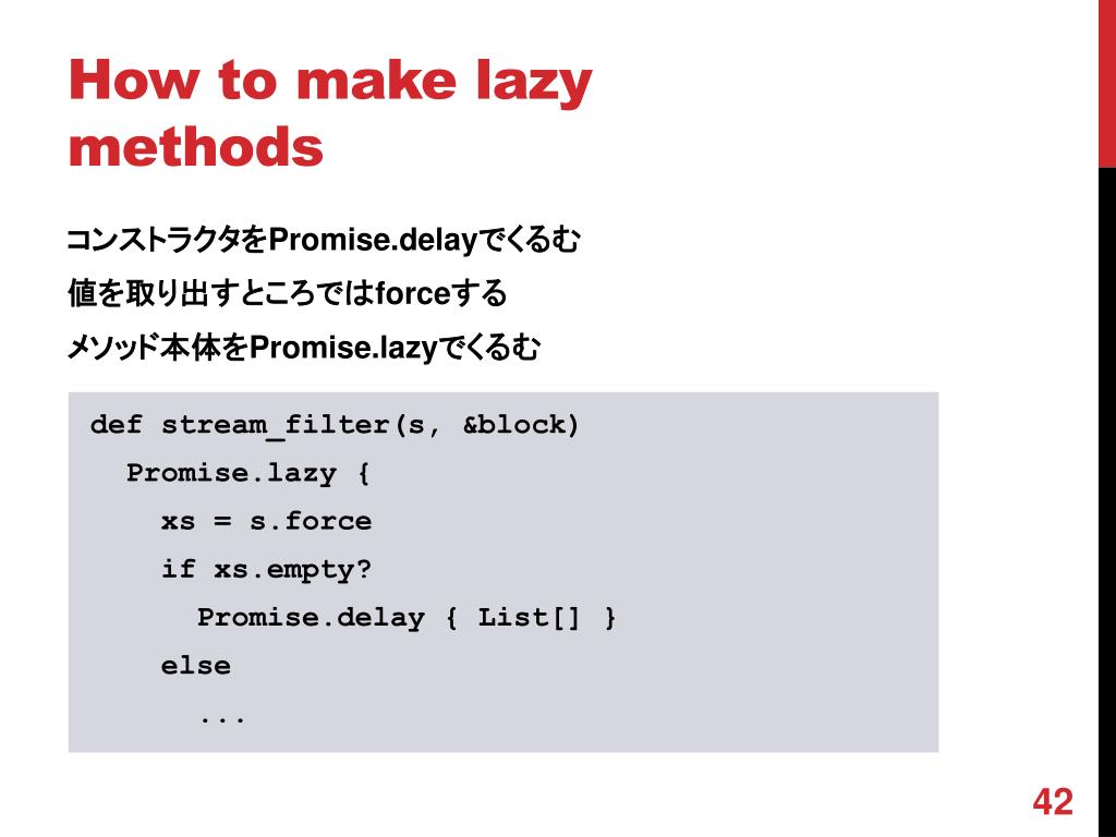 How to make lazy methods defstream_filter(s, &block) Promise.lazy { xs = s.force if xs.empty? Promise.delay { List[] } else ... コンストラクタをPromise.delayでくるむ 値を取り出すところではforceする メソッド本体をPromise.lazyでくるむ