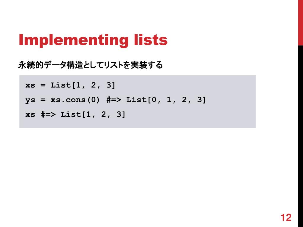 Implementing lists • 永続的データ構造としてリストを実装する xs = List[1, 2, 3] ys = xs.cons(0) #=> List[0, 1, 2, 3] xs #=> List[1, 2, 3]