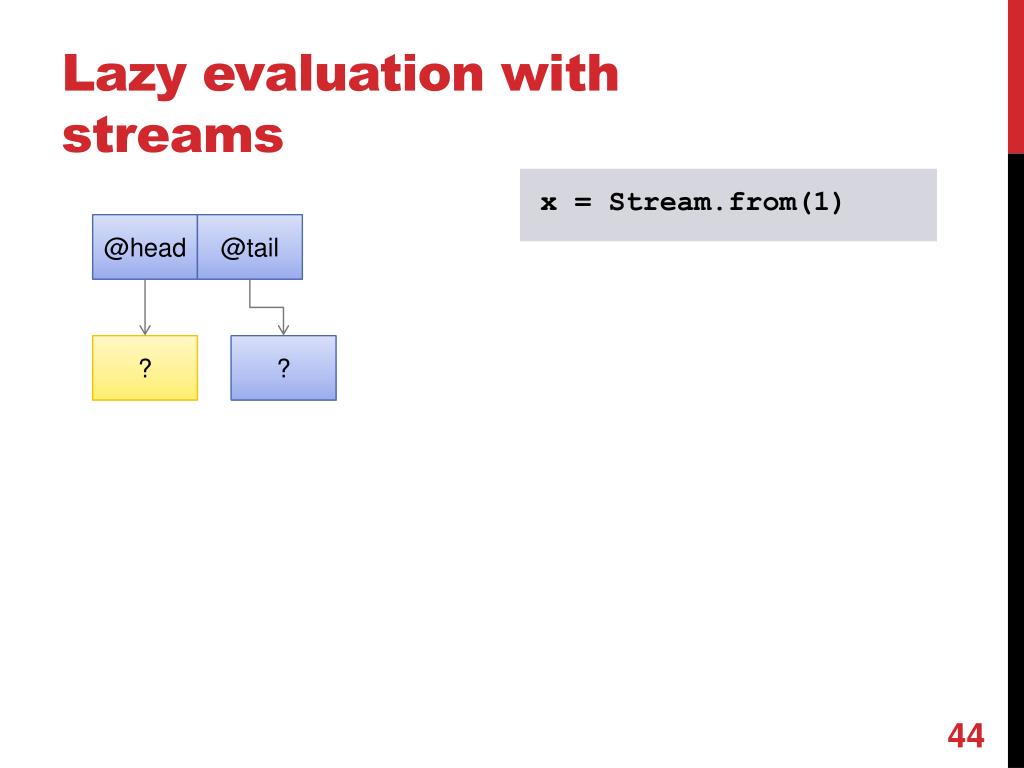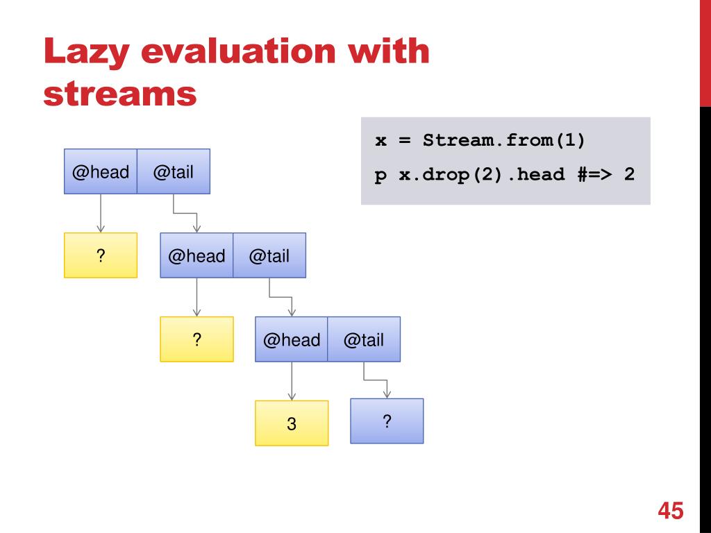 Lazy evaluation with streams x = Stream.from(1) p x.drop(2).head #=> 2 @head @tail ? @head @tail ? @head @tail ? 3