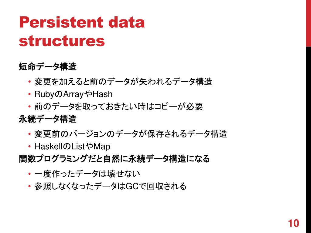 Persistent data structures • 短命データ構造 • 変更を加えると前のデータが失われるデータ構造 • RubyのArrayやHash • 前のデータを取っておきたい時はコピーが必要 • 永続データ構造 • 変更前のバージョンのデータが保存されるデータ構造 • HaskellのListやMap • 関数プログラミングだと自然に永続データ構造になる • 一度作ったデータは壊せない • 参照しなくなったデータはGCで回収される