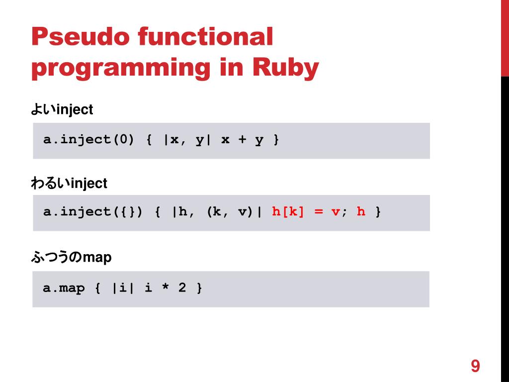Pseudo functional programming in Ruby a.inject(0) { |x, y| x + y } a.inject({}) { |h, (k, v)| h[k] = v; h } a.map { |i| i * 2 } よいinject わるいinject ふつうのmap