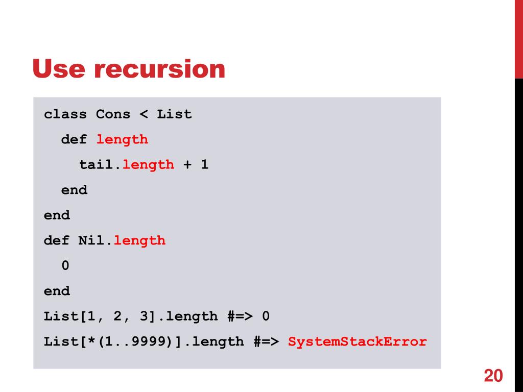 Use recursion class Cons < List deflength tail.length + 1 end end defNil.length 0 end List[1, 2, 3].length #=> 0 List[*(1..9999)].length #=> SystemStackError