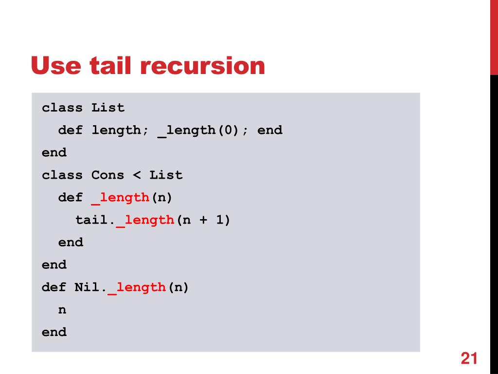 Use tail recursion class List deflength; _length(0); end end class Cons < List def_length(n) tail._length(n + 1) end end defNil._length(n) n end