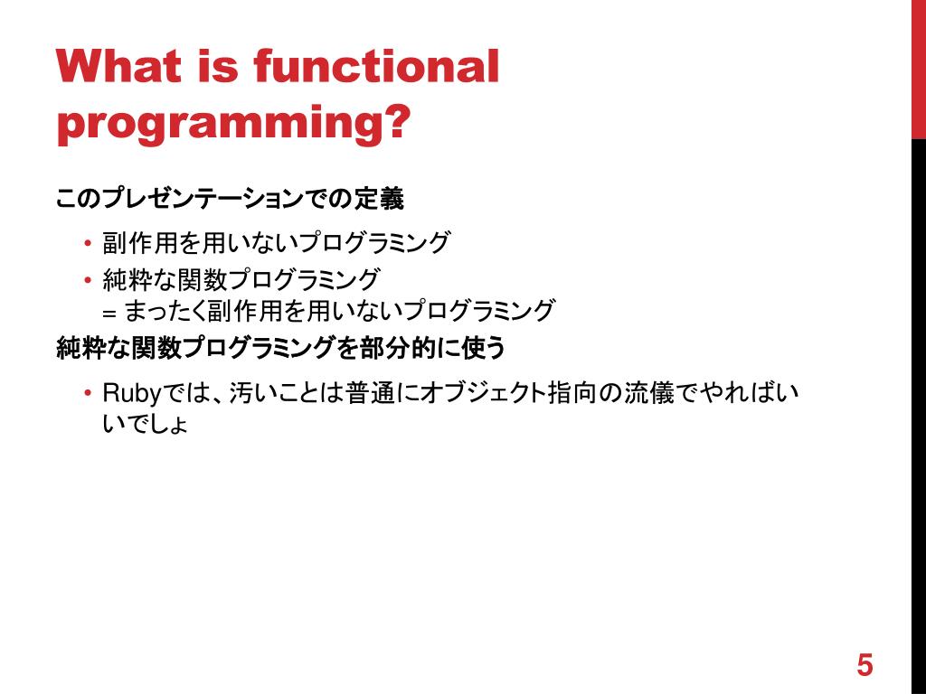 What is functional programming? • このプレゼンテーションでの定義 • 副作用を用いないプログラミング • 純粋な関数プログラミング= まったく副作用を用いないプログラミング • 純粋な関数プログラミングを部分的に使う • Rubyでは、汚いことは普通にオブジェクト指向の流儀でやればいいでしょ