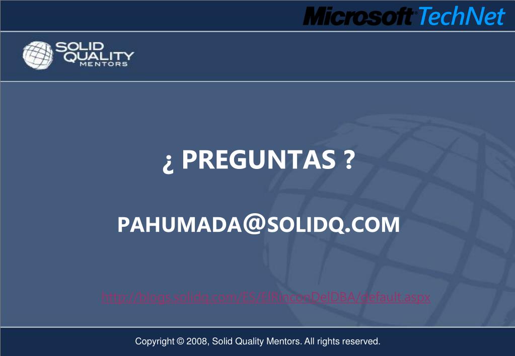 ¿ PREGUNTAS ?pahumada@solidq.com http://blogs.solidq.com/ES/ElRinconDelDBA/default.aspx