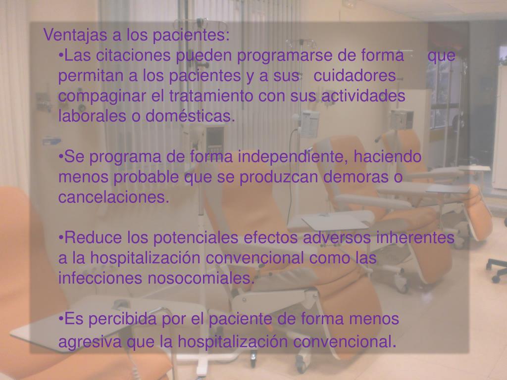 Ventajas a los pacientes: • Las citaciones pueden programarse de forma que permitan a los pacientes y a sus cuidadores compaginar el tratamiento con sus actividades laborales o domésticas. • Se programa de forma independiente, haciendo menos probable que se produzcan demoras o cancelaciones. • Reduce los potenciales efectos adversos inherentes a la hospitalización convencional como las infecciones nosocomiales. • Es percibida por el paciente de forma menos agresiva que la hospitalización convencional. .