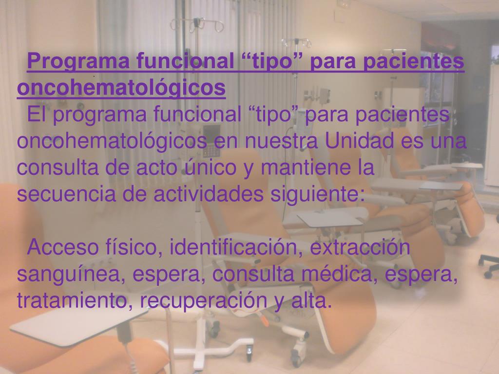 Programa funcional “tipo” para pacientes oncohematológicos El programa funcional “tipo” para pacientes oncohematológicos en nuestra Unidad es una consulta de acto único y mantiene la secuencia de actividades siguiente: Acceso físico, identificación, extracción sanguínea, espera, consulta médica, espera, tratamiento, recuperación y alta. .