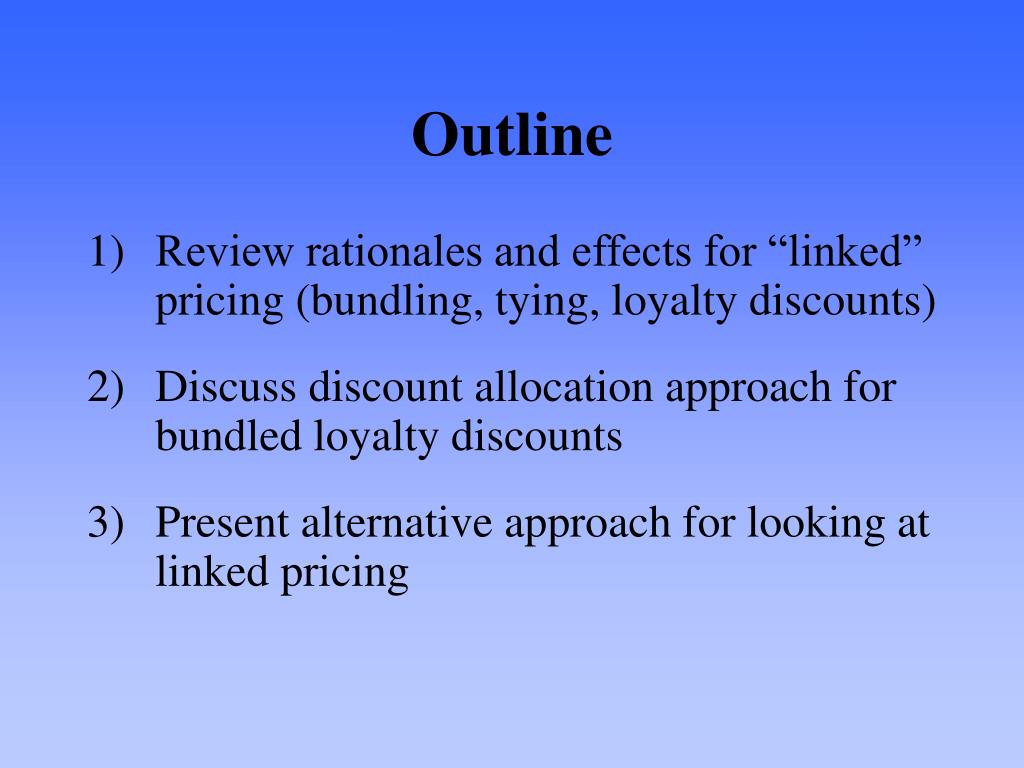 Outline • Review rationales and effects for “linked” pricing (bundling, tying, loyalty discounts) • Discuss discount allocation approach for bundled loyalty discounts • Present alternative approach for looking at linked pricing