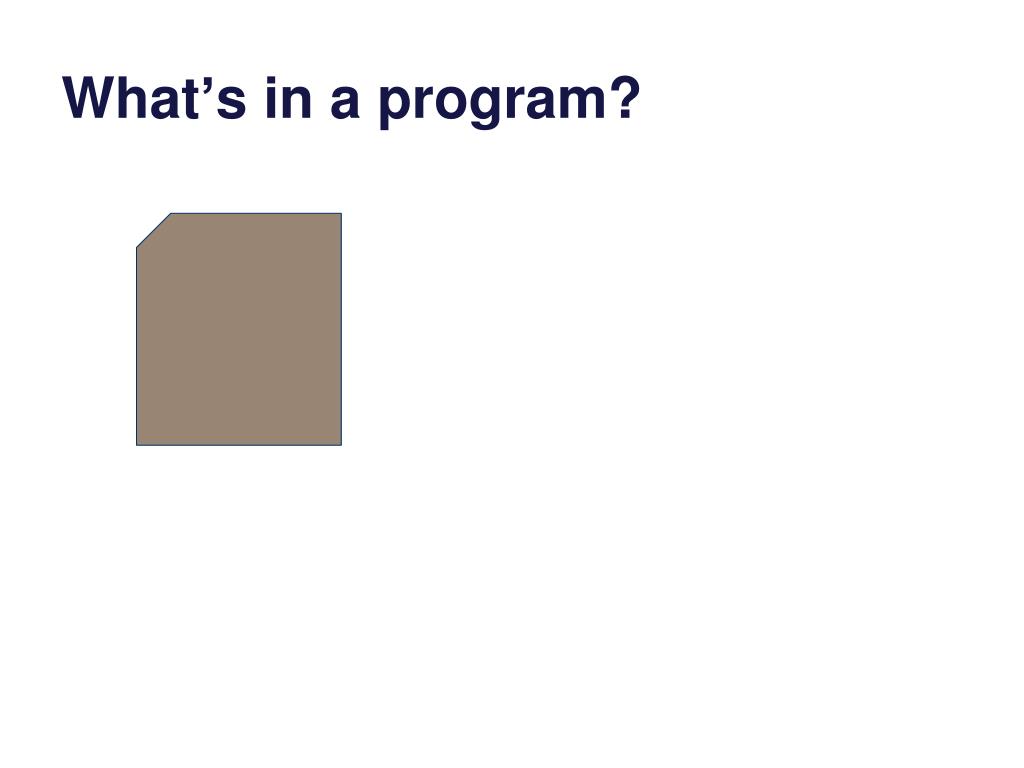 What’s in a program? data code instructions (“text”) procedures data global variables (“static”) constants (“immutable”) symbols (import/export) names interfaces signatures references