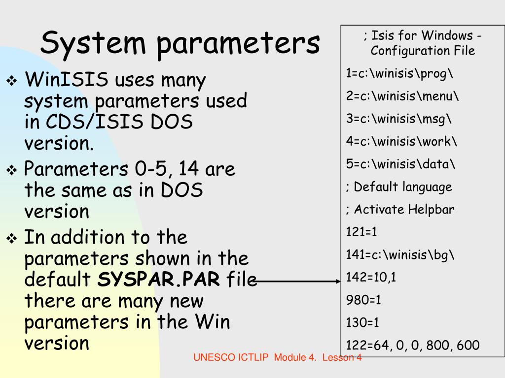 ; Isis for Windows - Configuration File 1=c:\winisis\prog\ 2=c:\winisis\menu\ 3=c:\winisis\msg\ 4=c:\winisis\work\ 5=c:\winisis\data\ ; Default language ; Activate Helpbar 121=1 141=c:\winisis\bg\ 142=10,1 980=1 130=1 122=64, 0, 0, 800, 600 System parameters • WinISIS uses many system parameters used in CDS/ISIS DOS version. • Parameters 0-5, 14 are the same as in DOS version • In addition to the parameters shown in the default SYSPAR.PAR file there are many new parameters in the Win version UNESCO ICTLIP Module 4. Lesson 4