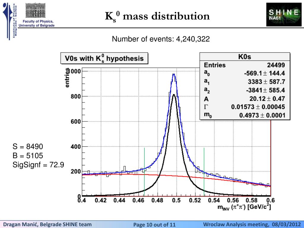 Ks0 mass distribution Number of events: 4,240,322 S = 8490 B = 5105 SigSignf = 72.9