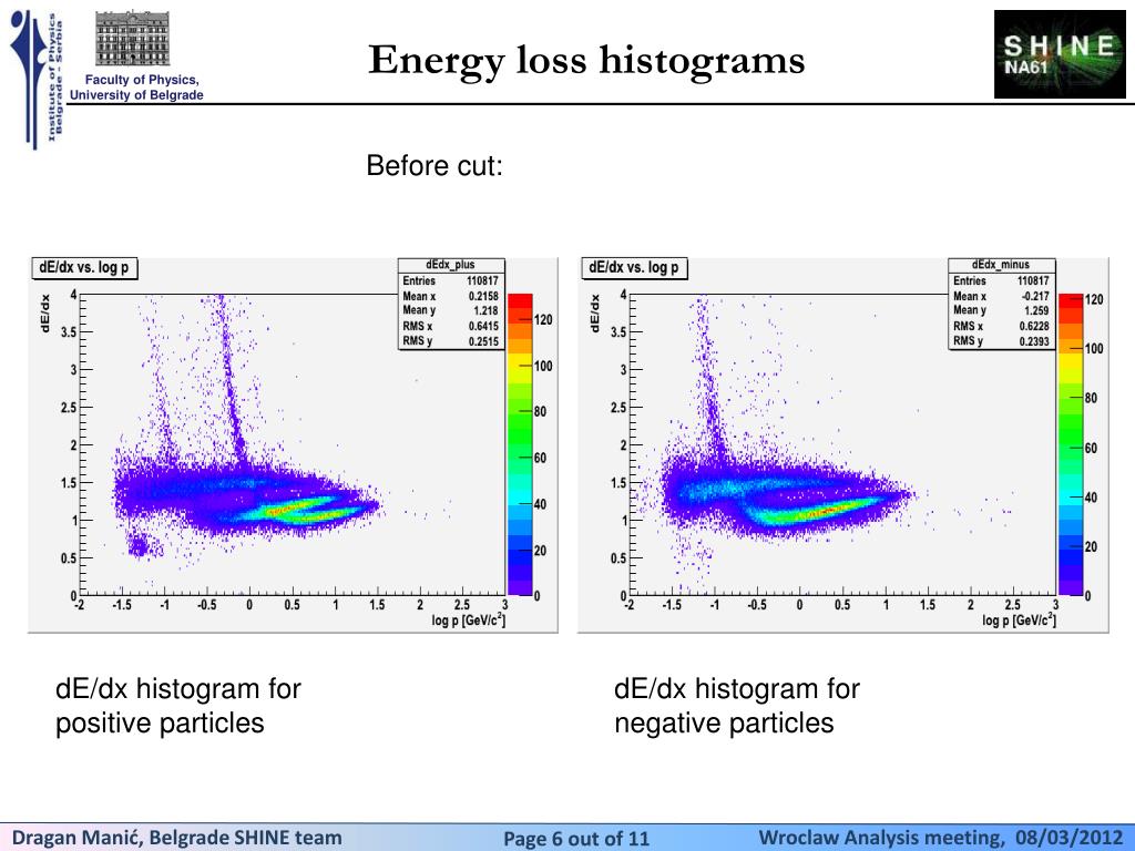 Energy loss histograms After cut: dE/dx histogram for positive particles dE/dx histogram for negative particles