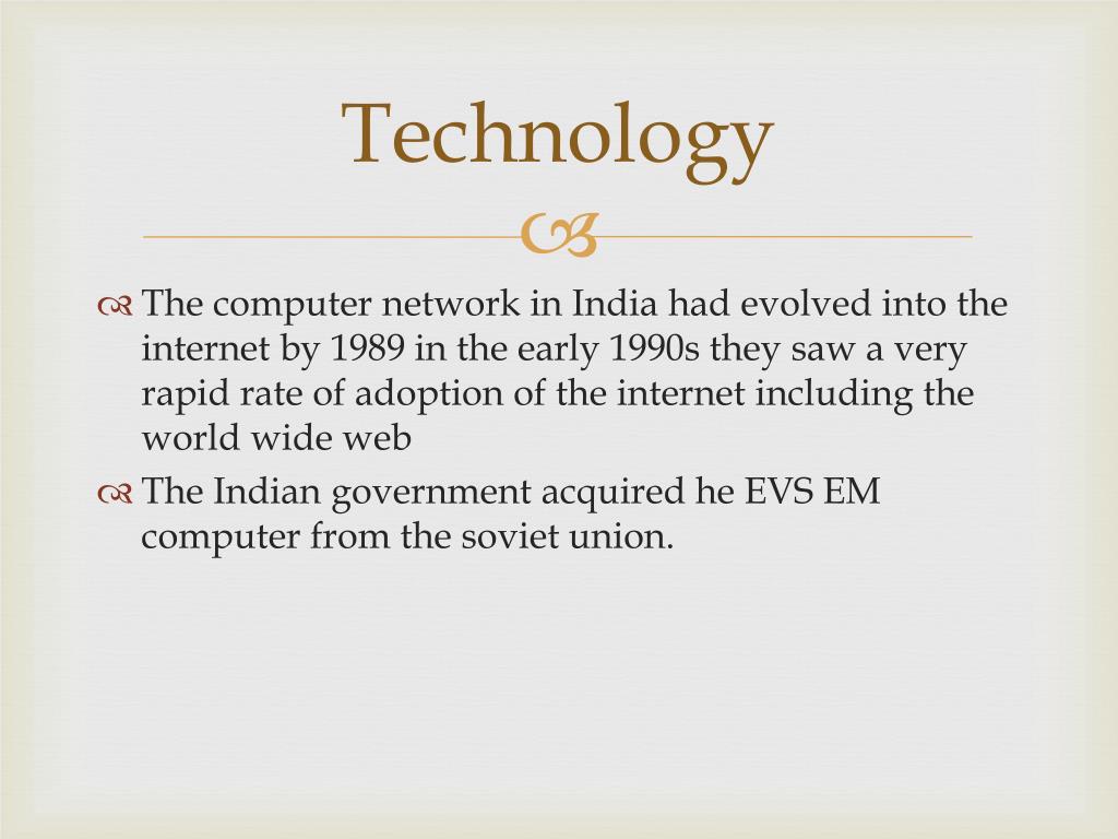 Technology • The computer network in India had evolved into the internet by 1989 in the early 1990s they saw a very rapid rate of adoption of the internet including the world wide web • The Indian government acquired he EVS EM computer from the soviet union.