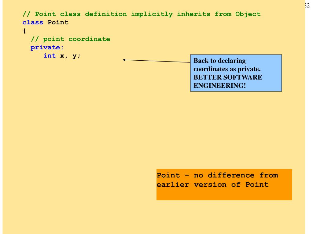 Back to declaring coordinates as private. BETTER SOFTWARE ENGINEERING! // Point class definition implicitly inherits from Object class Point { // point coordinate private: int x, y; Point – no difference from earlier version of Point
