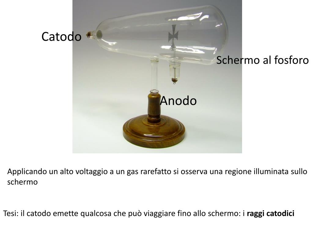 Catodo Schermo al fosforo Anodo Applicando un alto voltaggio a un gas rarefatto si osserva una regione illuminata sullo schermo Tesi: il catodo emette qualcosa che può viaggiare fino allo schermo: i raggi catodici