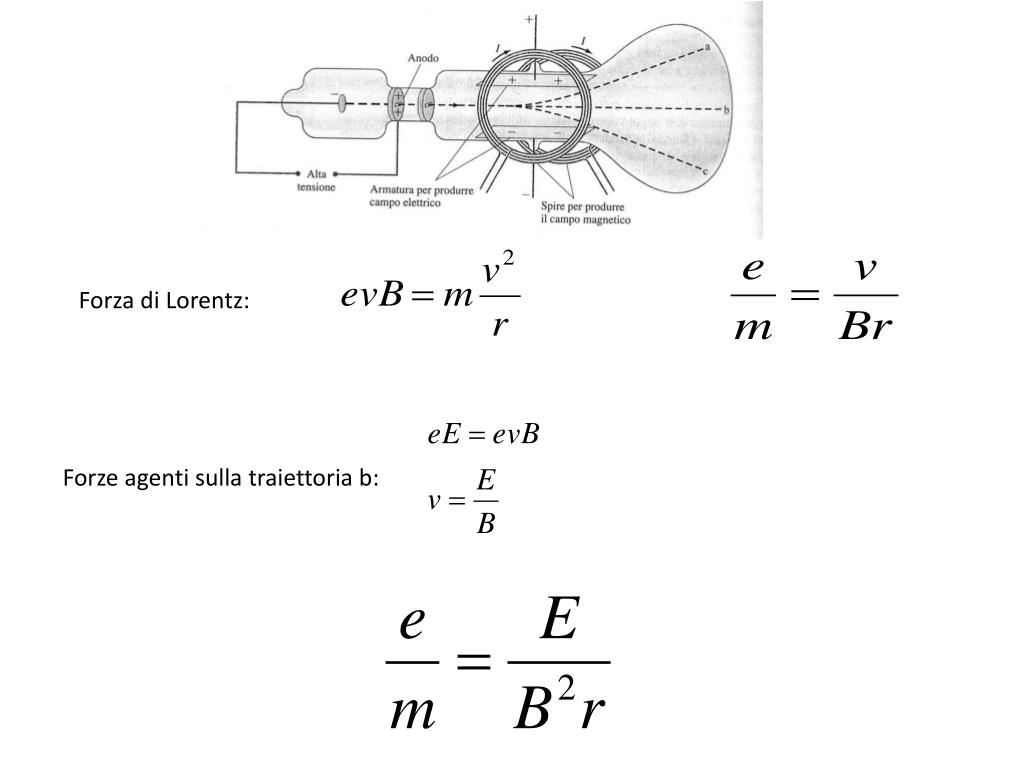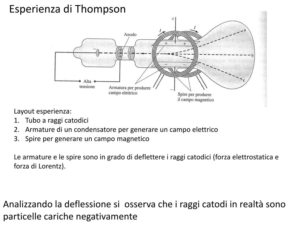 Esperienza di Thompson Layout esperienza: Tubo a raggi catodici Armature di un condensatore per generare un campo elettrico Spire per generare un campo magnetico Le armature e le spire sono in grado di deflettere i raggi catodici (forza elettrostatica e forza di Lorentz). Analizzando la deflessione si osserva che i raggi catodi in realtà sono particelle cariche negativamente