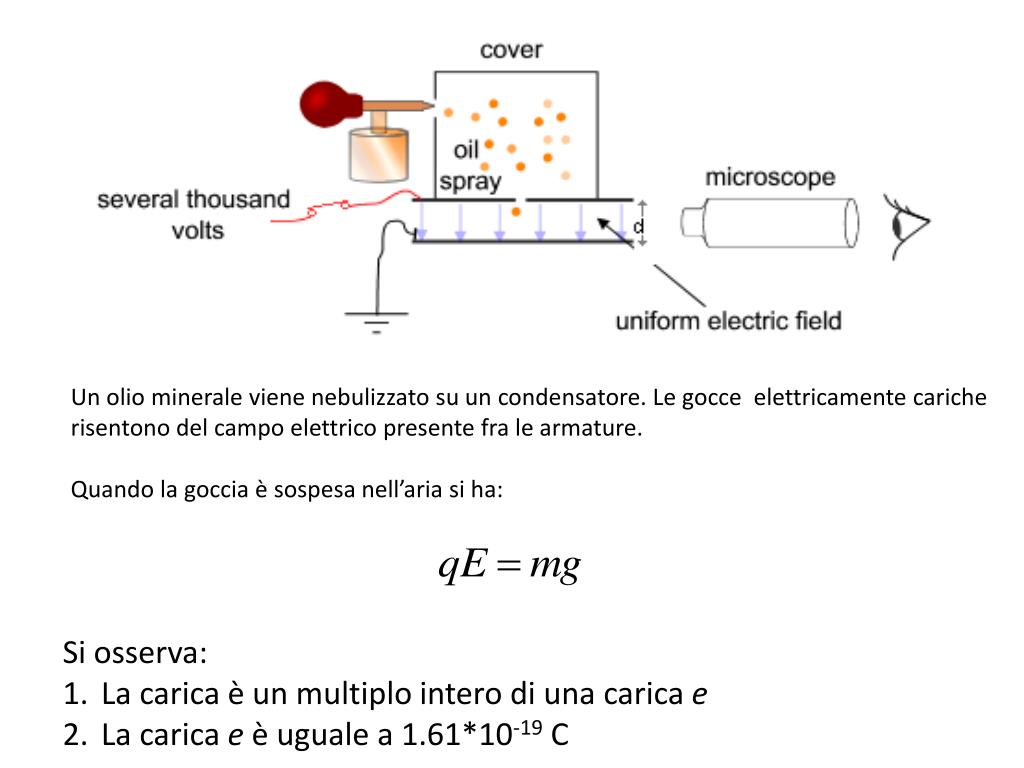 Un olio minerale viene nebulizzato su un condensatore. Le gocce elettricamente cariche risentono del campo elettrico presente fra le armature. Quando la goccia è sospesa nell’aria si ha: Si osserva: La carica è un multiplo intero di una carica e La carica e è uguale a 1.61*10-19 C